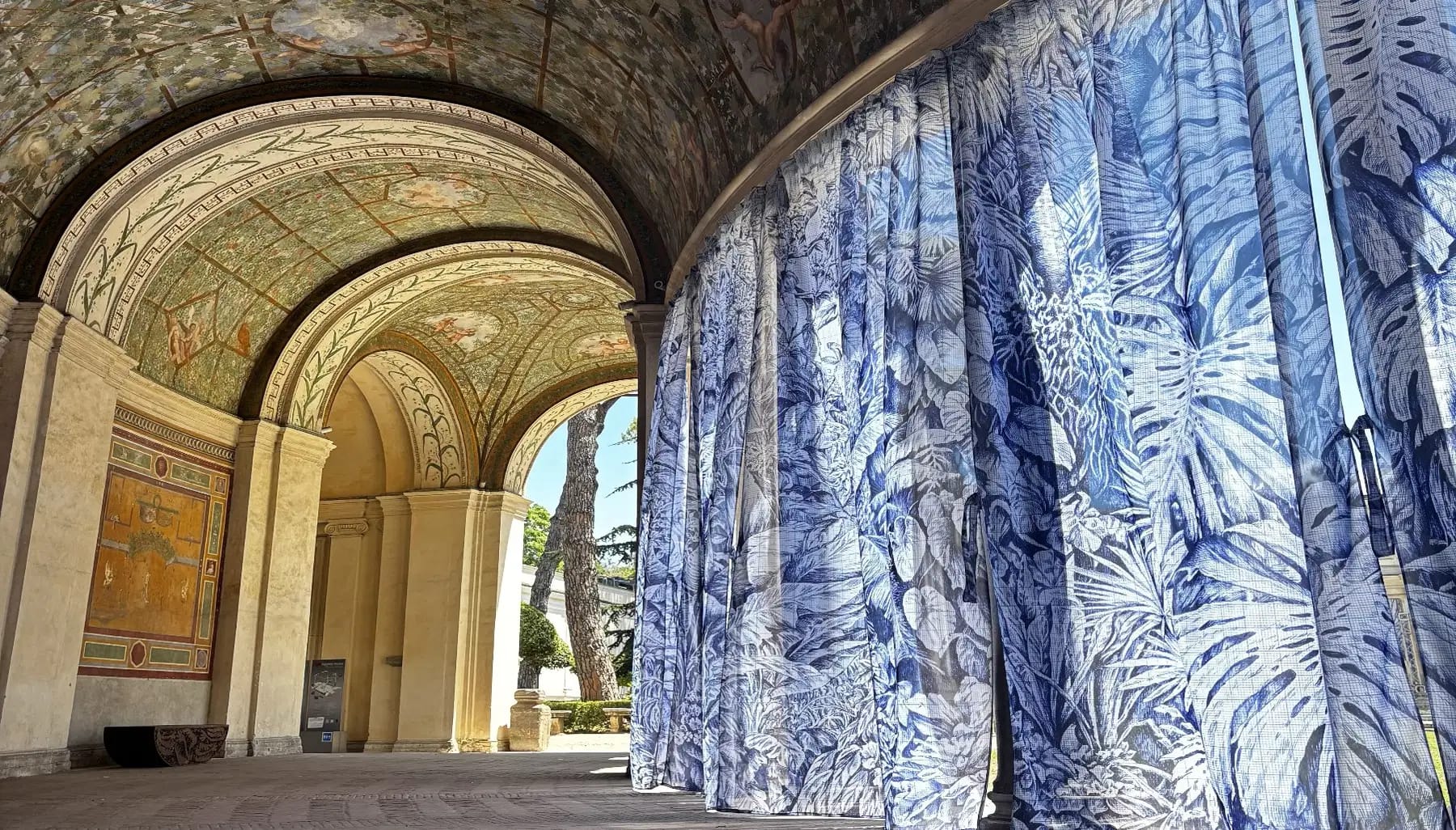 Una grande installazione disegnata con penna Bic ha trasformato la loggia del Museo Etrusco di Villa Giulia, a Roma, in un paesaggio immaginato e attraversabile.