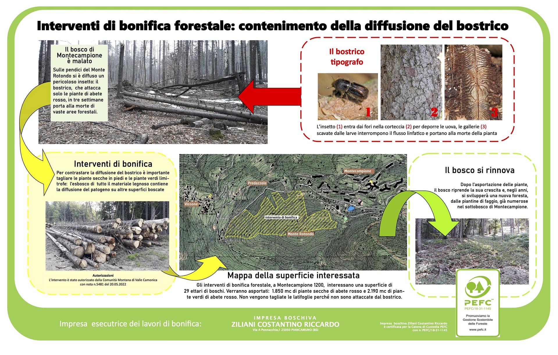 L’azienda ha presentato le iniziative di coinvolgimento della popolazione per far capire l’emergenza dei danni del bostrico e dell’utilità pubblica dell’intervento di bonifica forestale nei boschi nel Comune di Pian Camuno (BS).